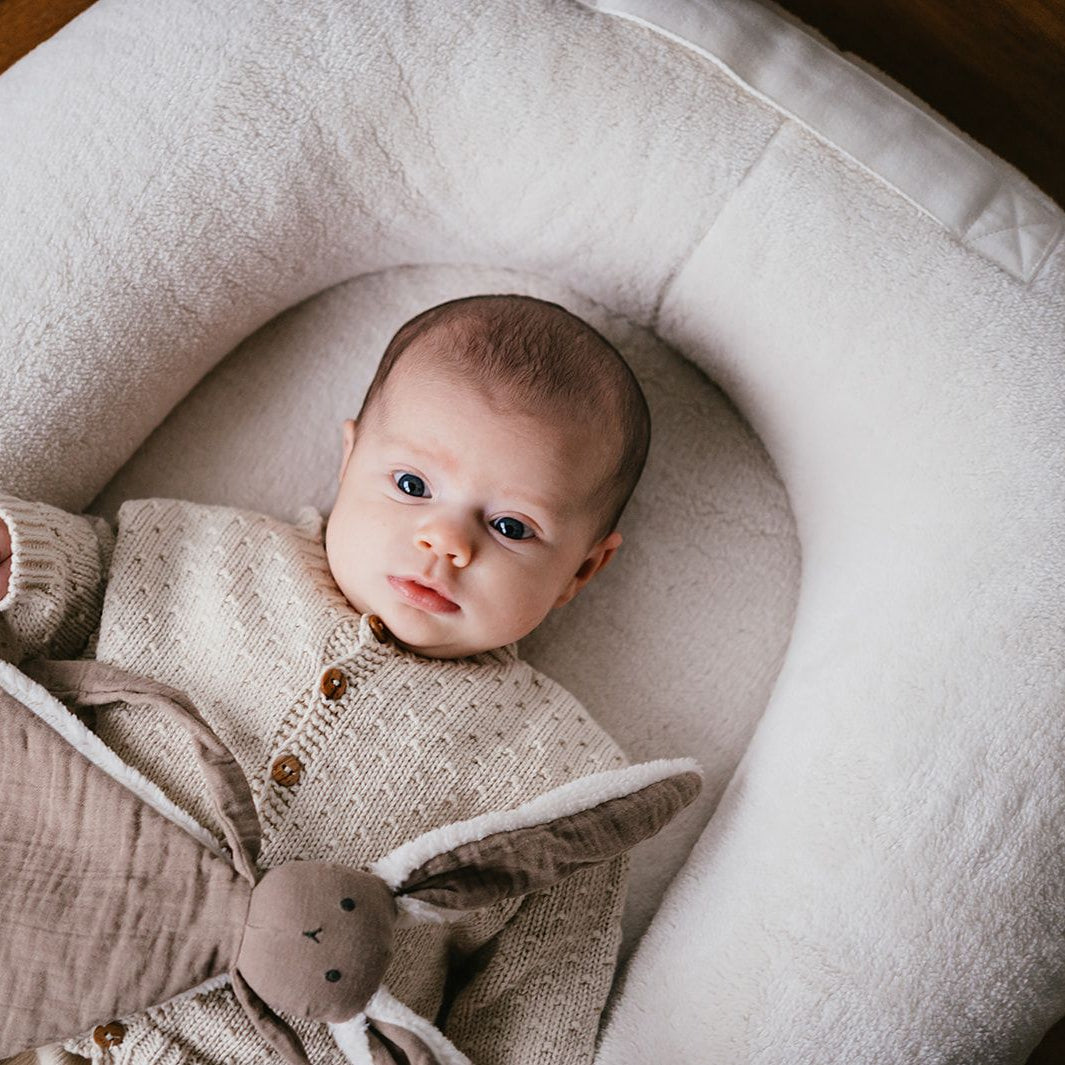 Dit knuffelzachte babynestje van heerlijke teddy-stof biedt je baby overal in huis een veilig en geborgen plekje. Of het nu in de box, op de bank of op het kleed is – de mogelijkheden zijn eindeloos! De verhoogde, gewatteerde randen en zachte bodem zorgen voor extra bescherming. En dankzij de handige, bijgeleverde draagtas neem je het babynestje makkelijk mee, zodat je ook op bezoek een vertrouwde cocon kunt creëren. Het nestje is eenvoudig te wassen, omdat zowel het matrasje als de rand volledig verwijderbaar is. Gebruik het babynest altijd onder toezicht en niet als slaapplaats voor de nacht.