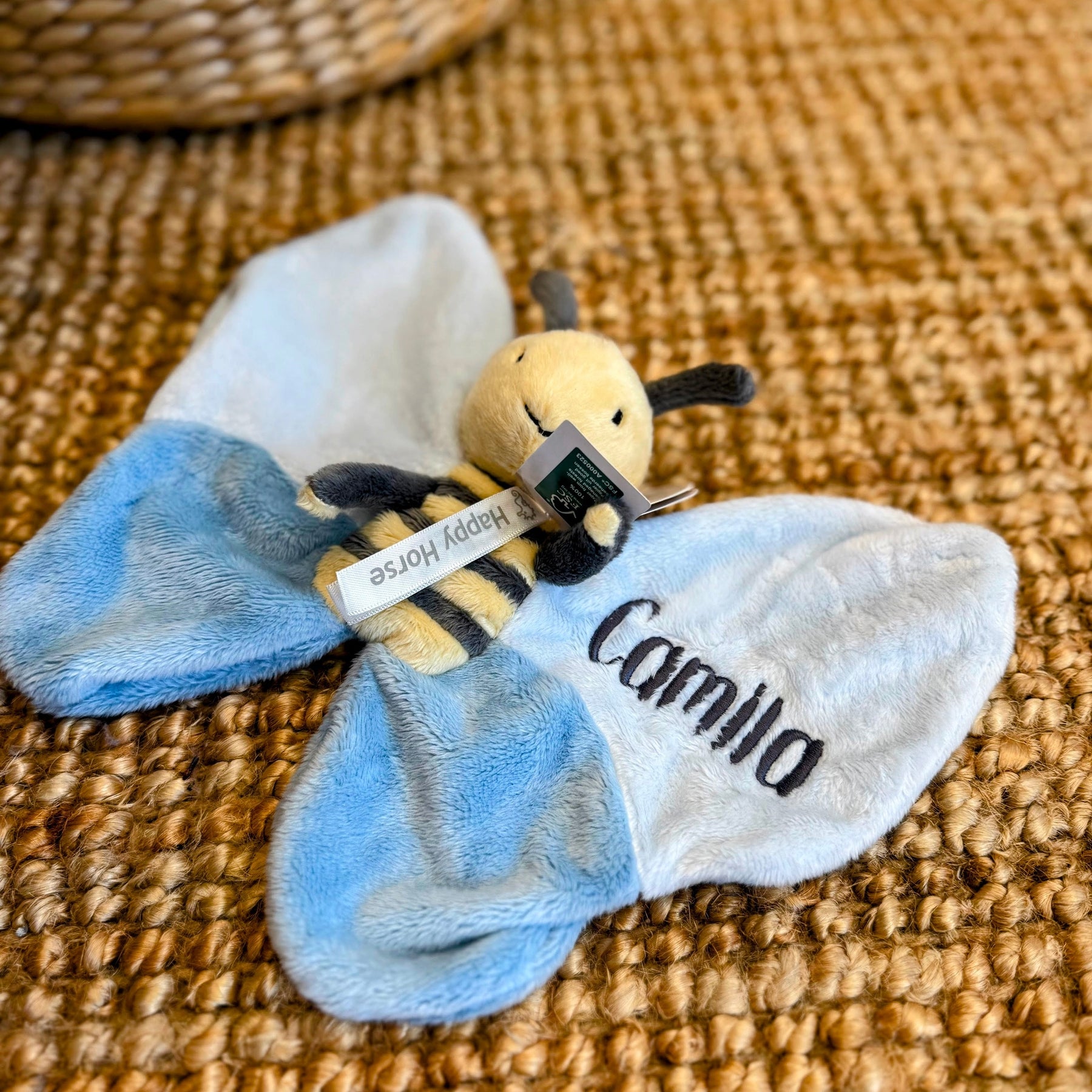Het knuffeldoekje Bee Benja is niet alleen ongelofelijk zacht, maar kan ook gemakkelijk worden vastgehouden aan zijn oren of armen. Het biedt troost, brengt rust en is voor veel kinderen al snel een onmisbare vriend! De naam wordt boven het kruisje geborduurd.
