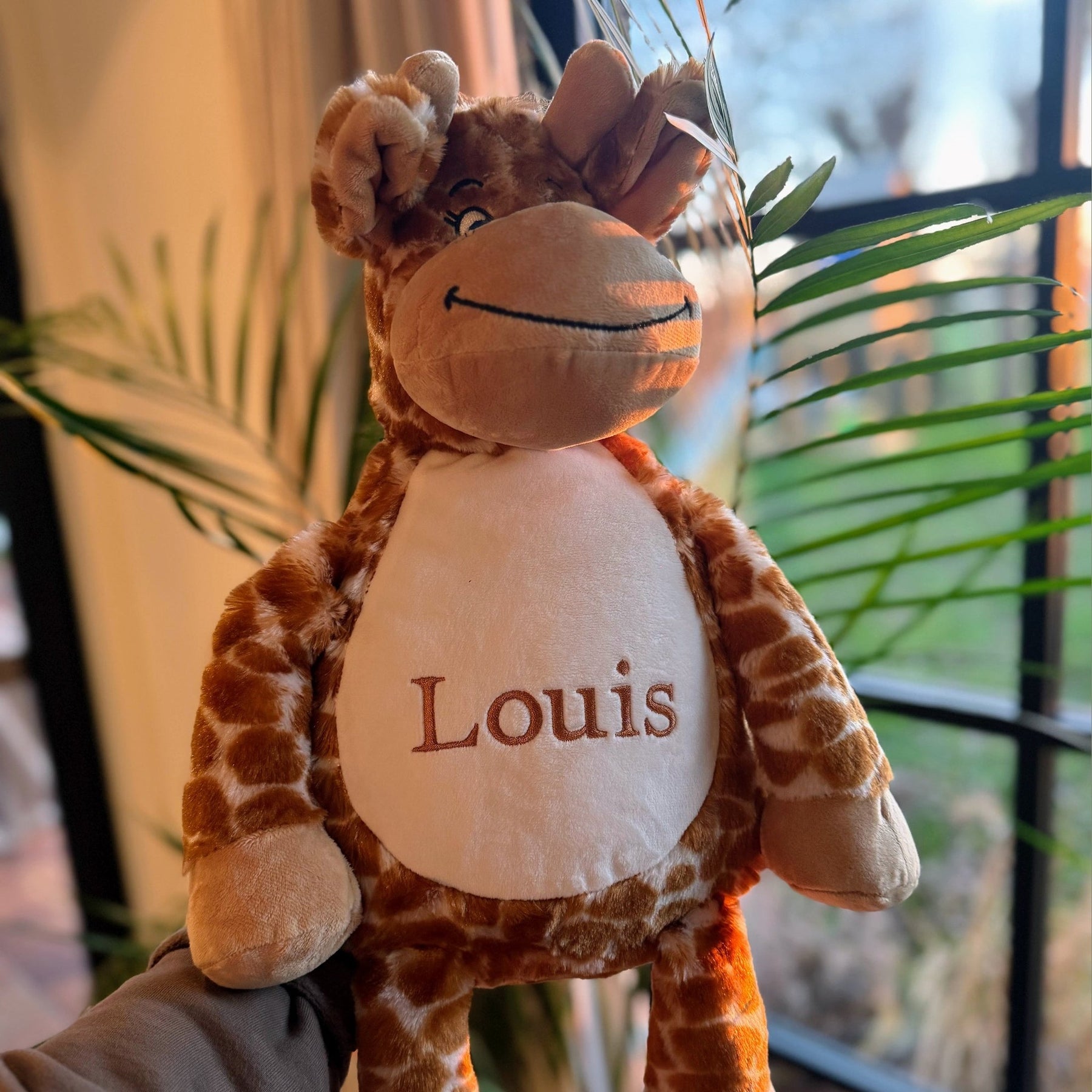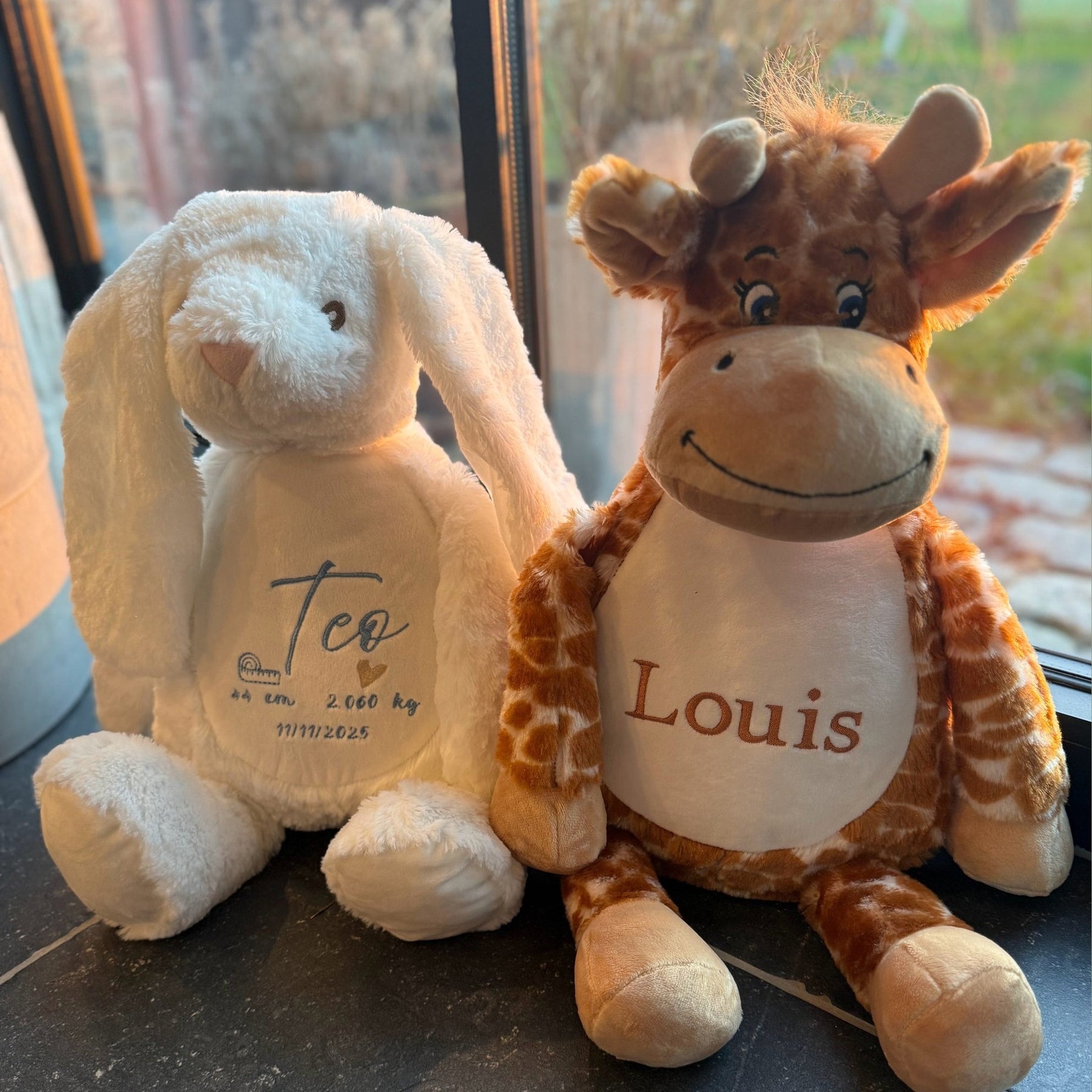 Je kiest zelf wat je op de knuffel laat borduren: enkel de naam, of ook geboortegegevens zoals gewicht, lengte en uur. Elk detail wordt zorgvuldig geborduurd, in een kleur en lettertype die bij het diertje passen. Kleine icoontjes (zoals een weegschaal, klokje of meetlatje) maken het geheel extra schattig en uniek. Zo wordt elke knuffel een blijvende herinnering aan dat eerste grote moment.