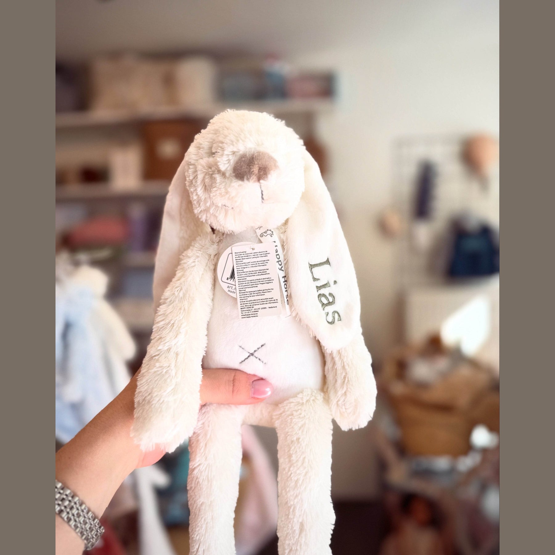 Knuffels van Happy Horse met een geborduurde naam.