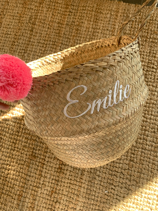 De basis van elke speelgoedmand wordt met de hand gevlochten door getalenteerde ambachtslieden in Marokko, volgens traditionele technieken. Geen enkele mand is identiek – elk stuk is uniek! Daarna komen ze naar ons atelier in Merchtem, waar we jouw mand afwerken met een persoonlijke toets, zoals een handgemaakte punnik naam of speelse pompons. Zo krijg jij een écht uniek stuk in handen.