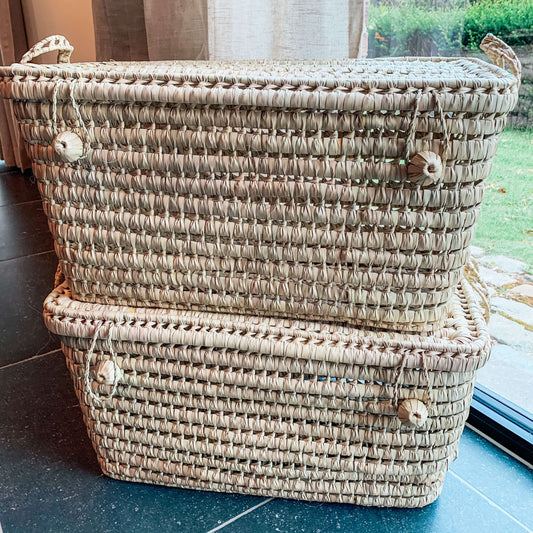 Breng warmte en stijl in de kinderkamer met onze handgemaakte speelgoedmanden uit Marokko. Elke mand is zorgvuldig gevlochten uit duurzame palmbladen, een natuurlijk materiaal dat zorgt voor een ecologische en stijlvolle opbergoplossing. Deze manden zijn niet alleen praktisch, maar ook een echte blikvanger in elk interieur.