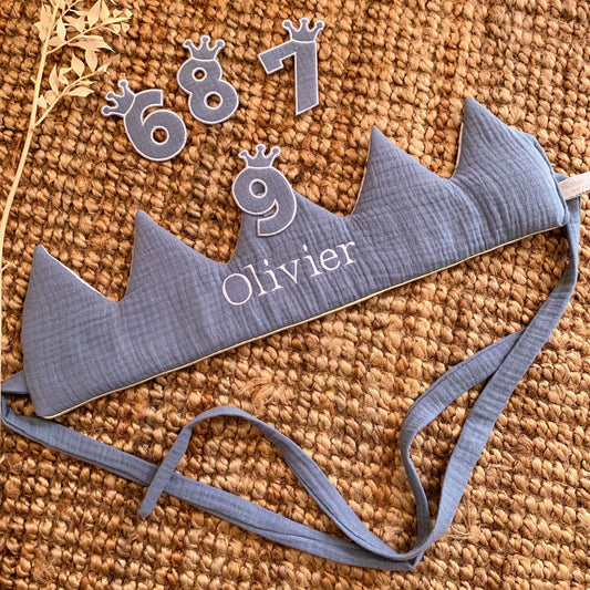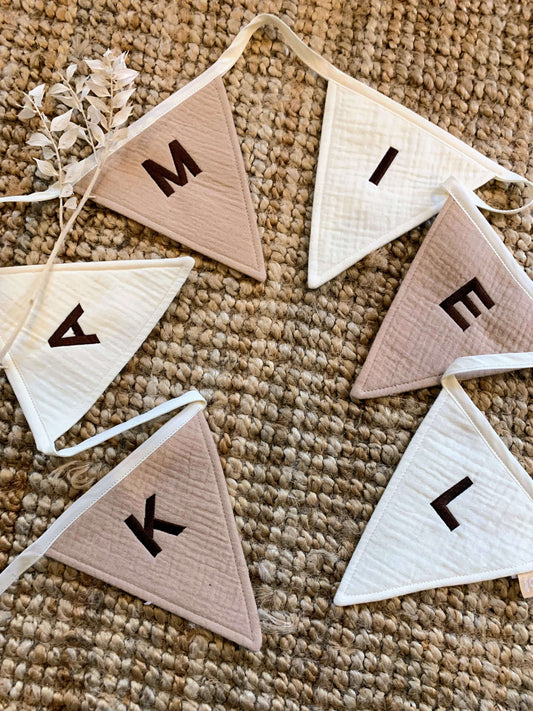 Je kan zowel het handgemaakte & herbruikbaar -verjaardagskroon als de -vlaggenlijn leuk bedrukken met de naam van je baby of kindje.
