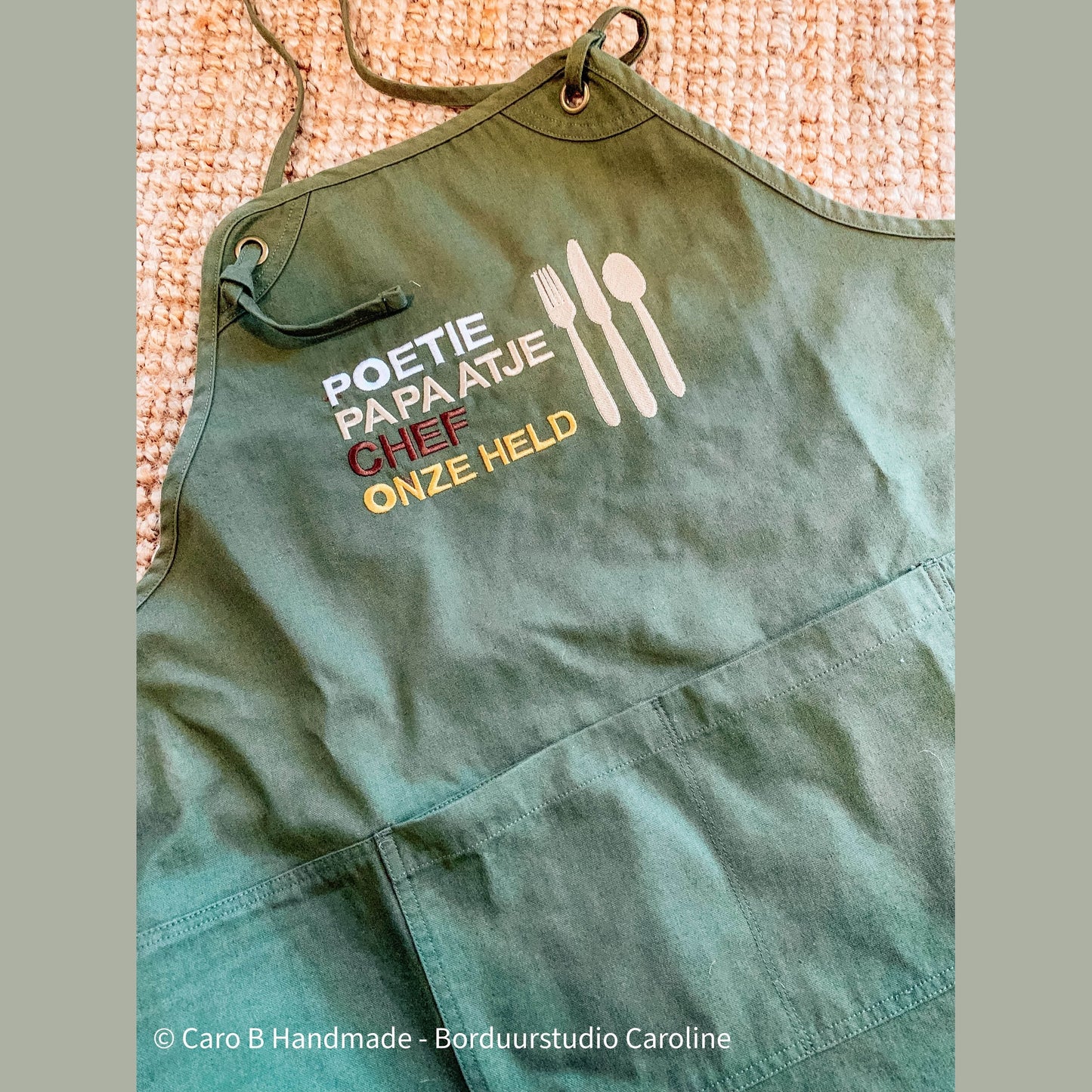 Keukenschort, gepersonaliseerd met borduur, de ideale vaderdag of moederdag cadeau.