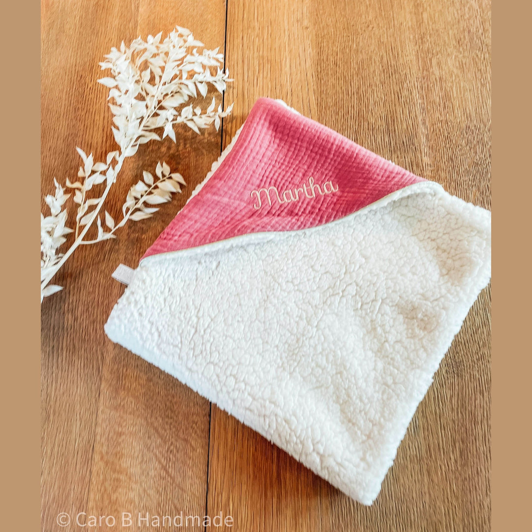Wikkeldeken of omslagdoek, geborduurd met naam.