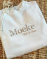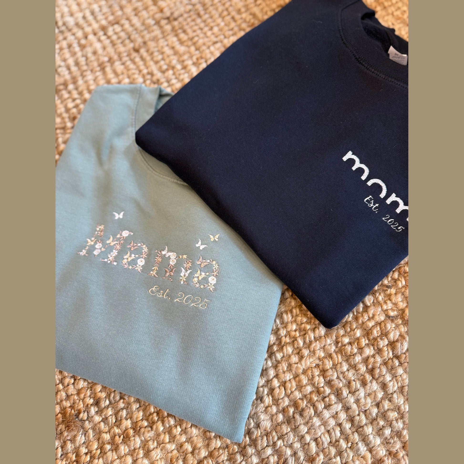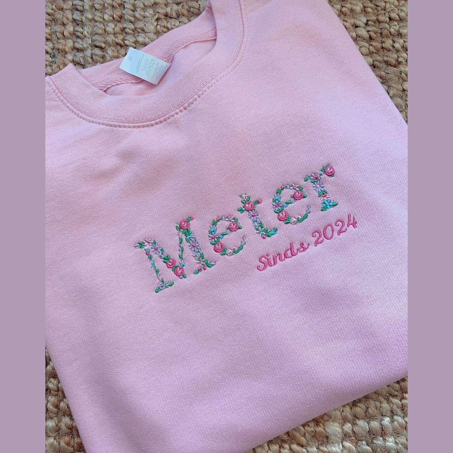 De eyecatcher van deze sweater is het prachtige bloemenalphabet. Jij kiest zelf de stijl: bloemen, of bloemen met vlinders (eigen ontwerp) – elk met de geborduurd in ons atelier. Voeg daar een naam of titel aan toe, zoals Mama, Metie, Oma, Boysmom of Girlsmom, en je hebt een persoonlijk kledingstuk dat écht raakt.