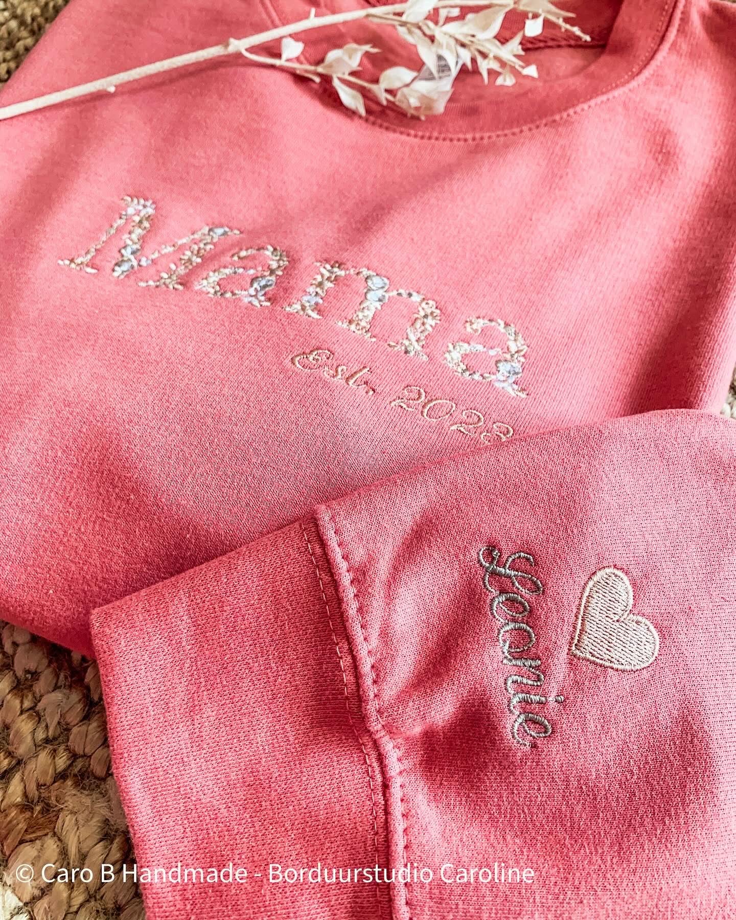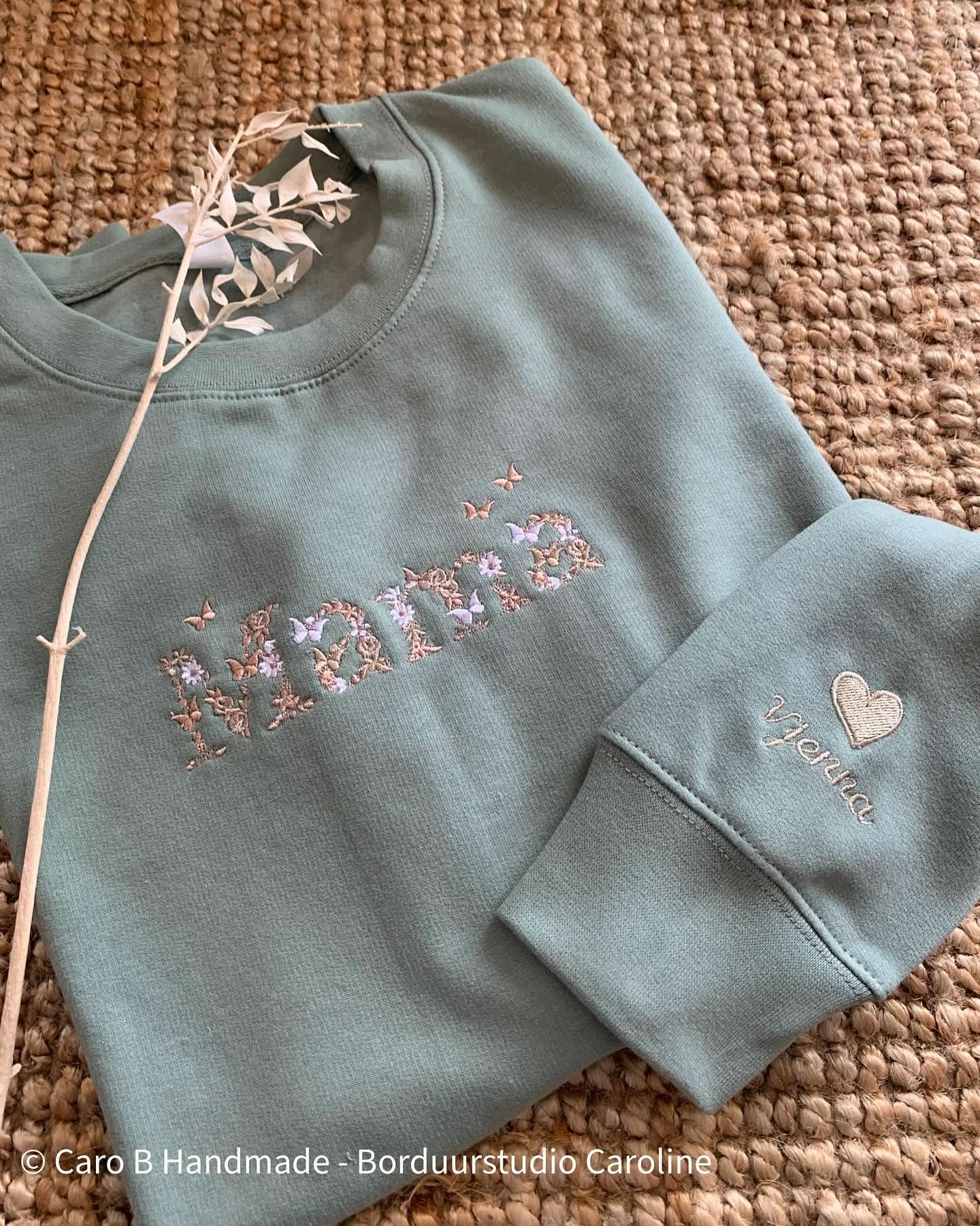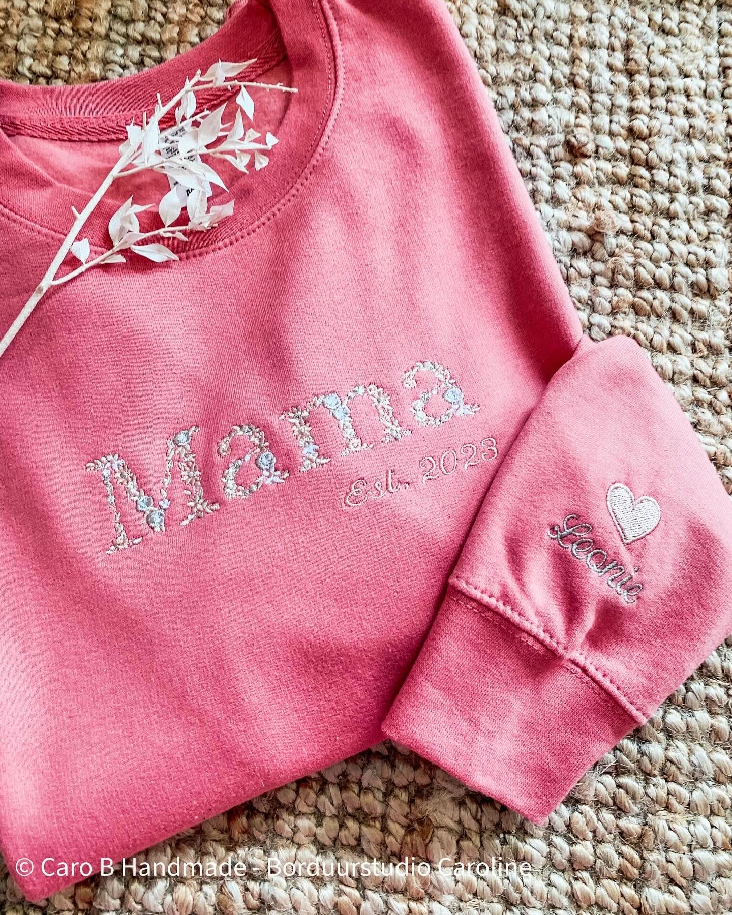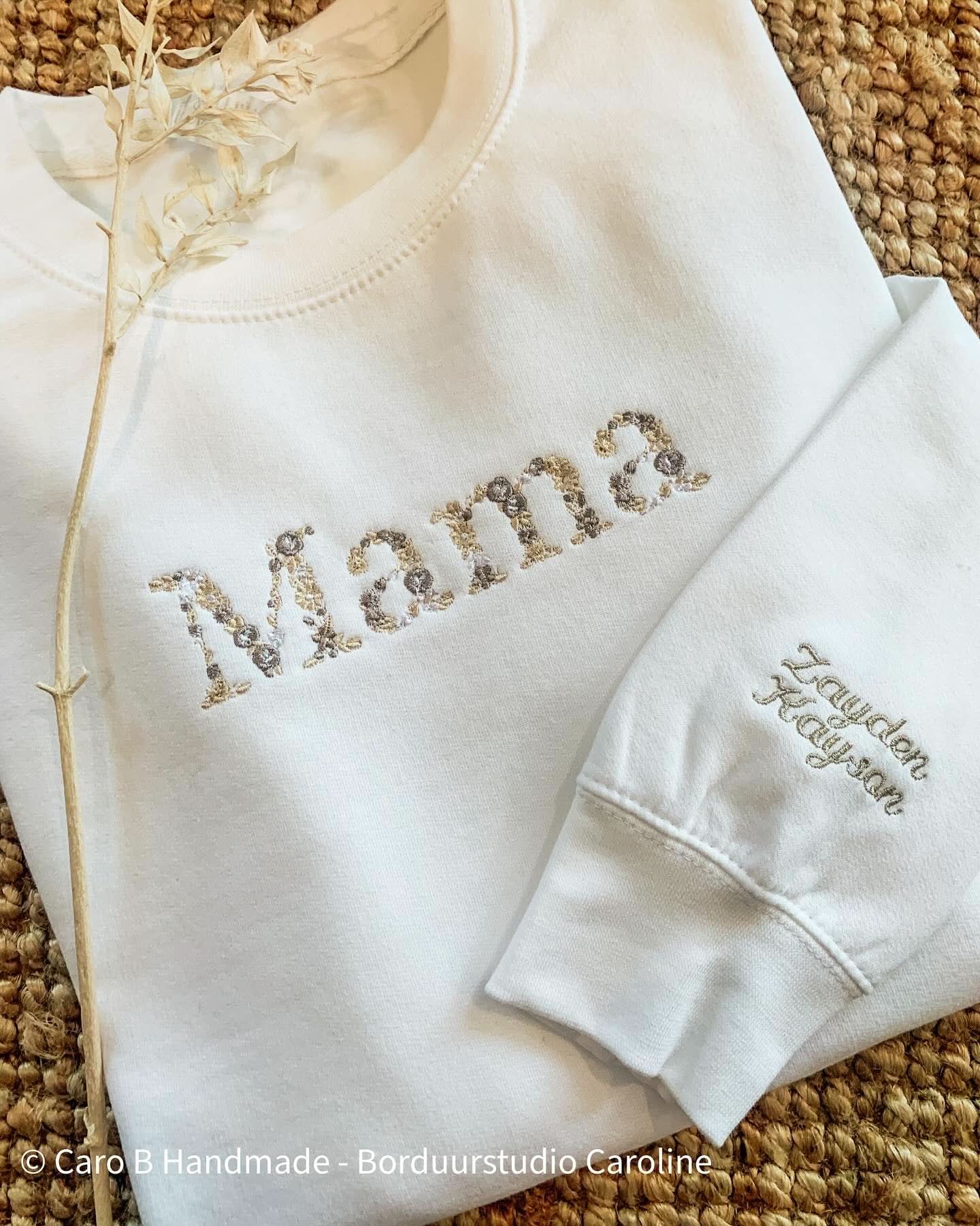 trui moederdag, mama trui geborduurd, gepersonaliseerde sweater naam, bloemenletters naam, cadeau voor mama, meter worden cadeau, oma trui, trui met betekenis, duurzame trui België, bloemen borduren, cadeau voor meter, Caro B trui, sweater met bloemenletters, handgemaakte trui België, zachte damestrui, gepersonaliseerde kleding vrouw, naam op sweater, Belgische webshop, handgemaakt cadeau vrouw, mama sweater met stijl