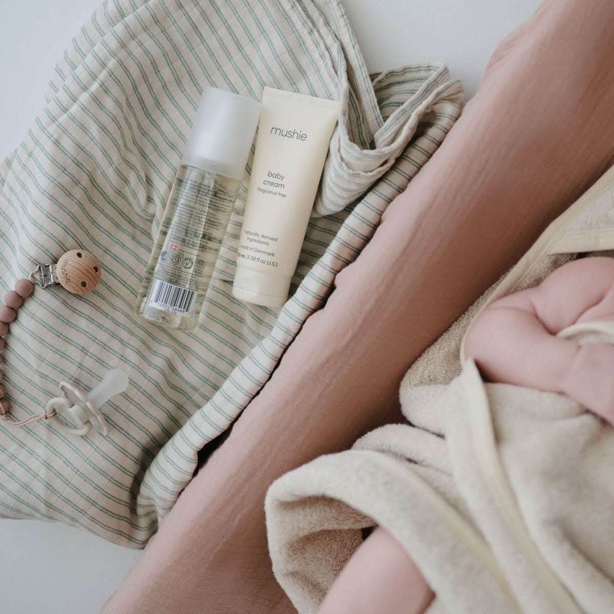 Ontdek de verzorgende kracht van Mushie's Baby olie.