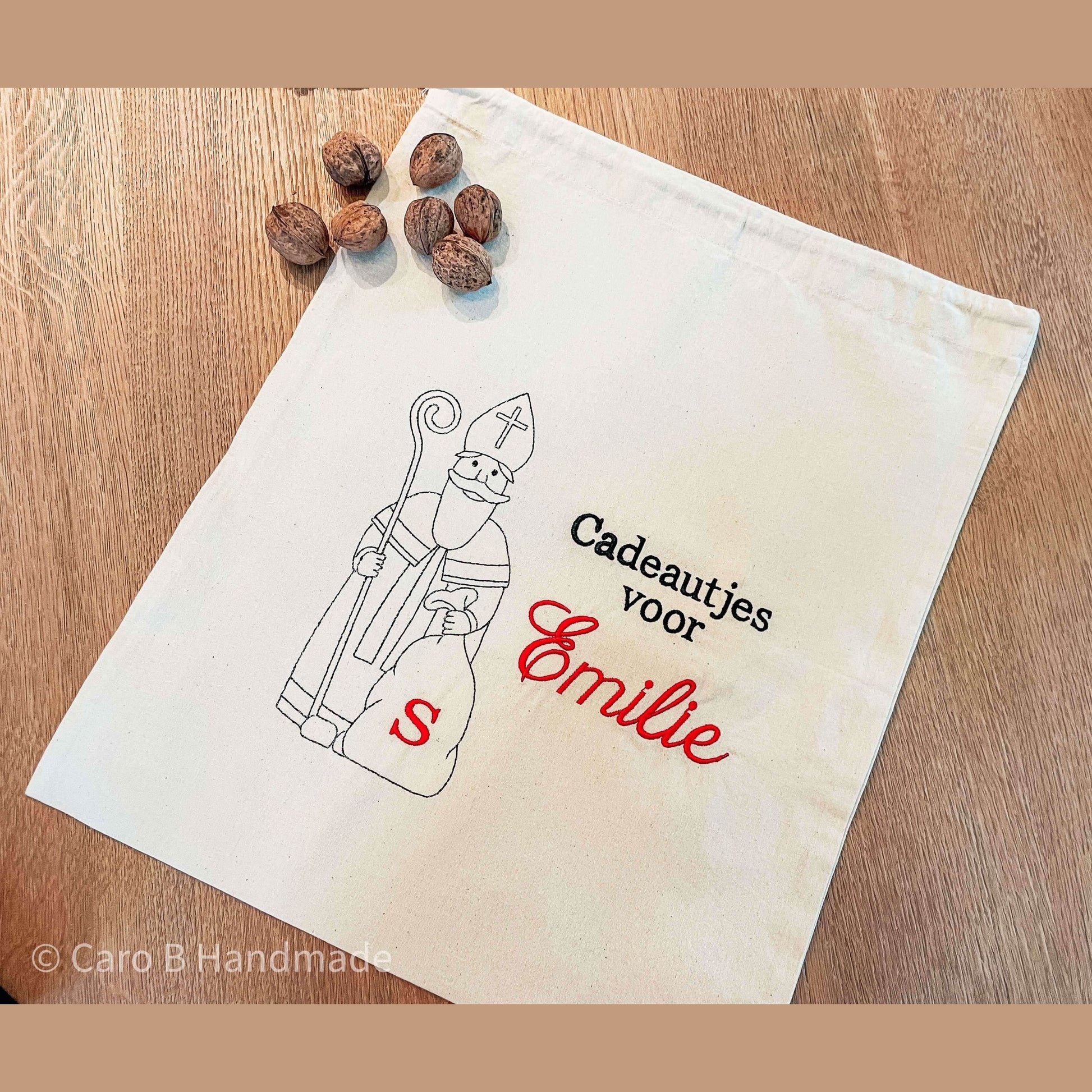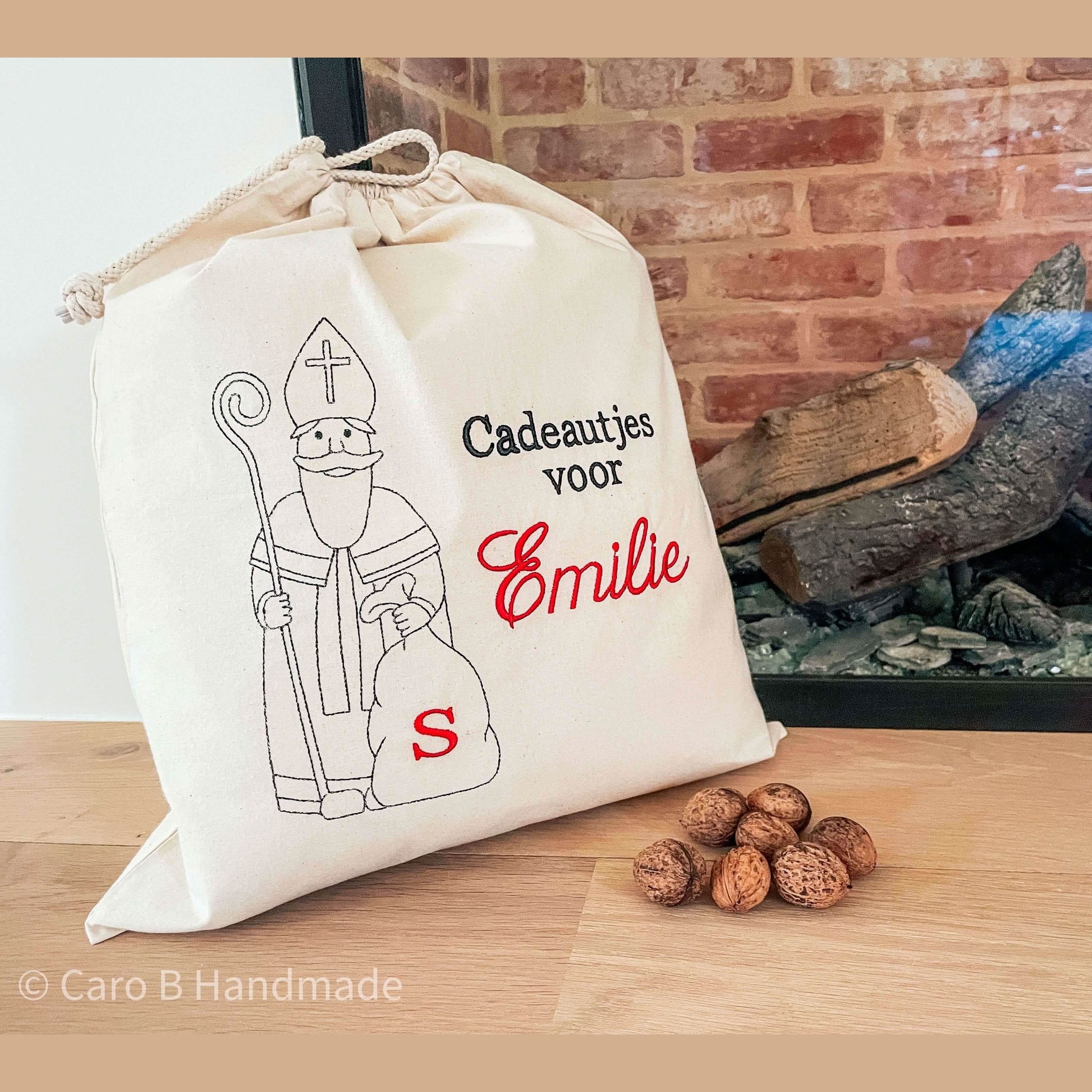 Verzamel alle cadeaus in een unieke zak van Sinterklaas met een geborduurde naam.