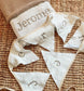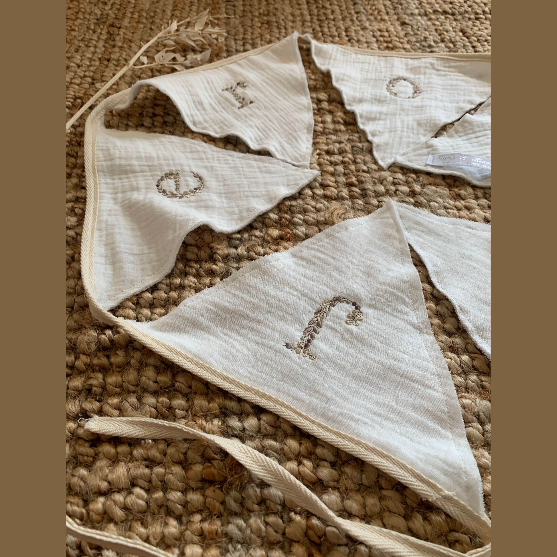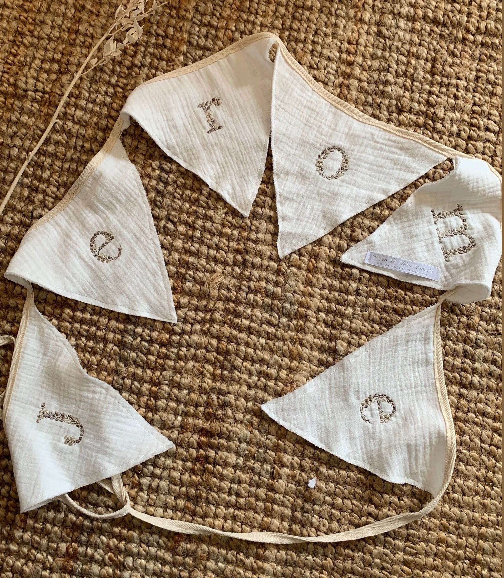 De vlaggenlijn kan je volledig personaliseren naar wens, kies je hydrofielstof en laat de naam van je kindje op borduren.