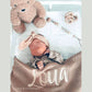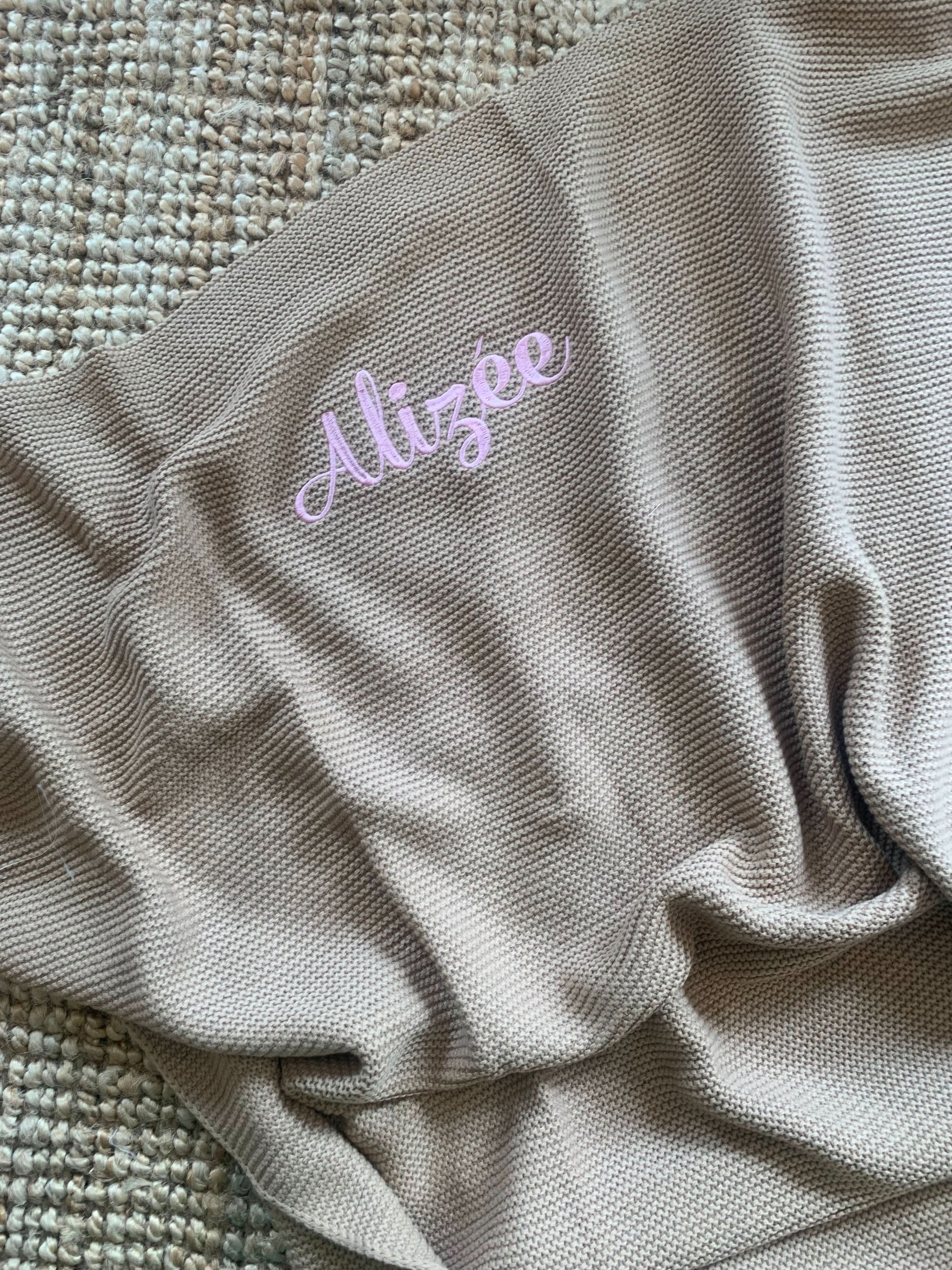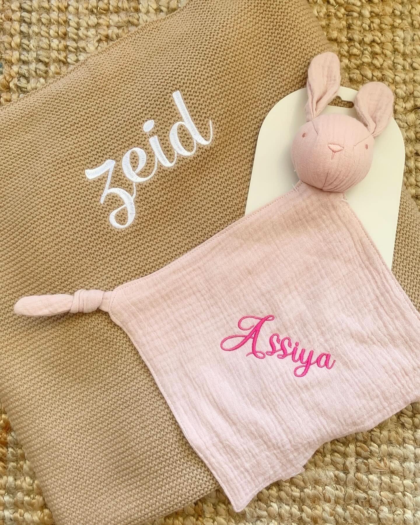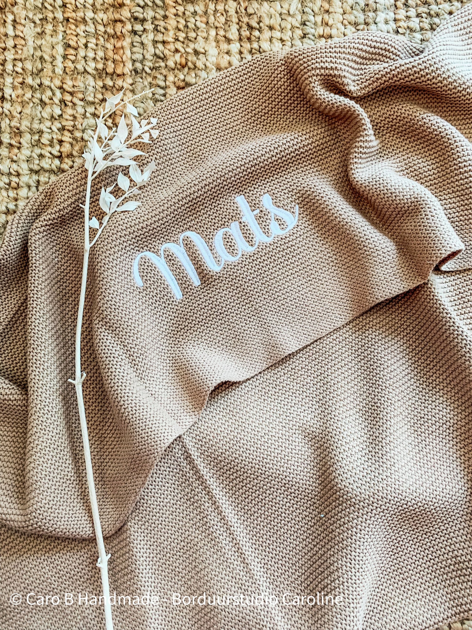 Maak het dekentje écht uniek met een persoonlijke borduring. In onze winkel in Merchtem kan je zelf de naam, geboortedatum of zelfs een kleine tekening laten borduren op het dekentje. Je kiest volledig zelf: