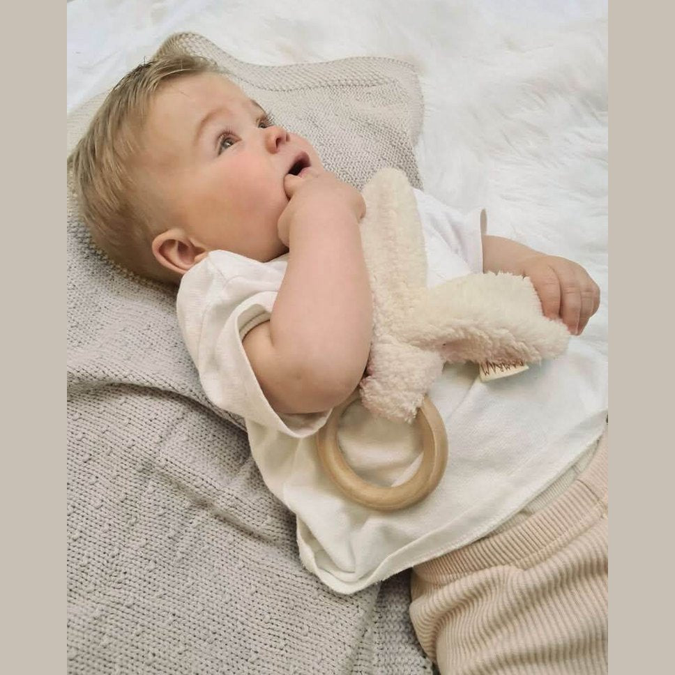 Deze Bunny bijtring is niet alleen heel schattig, het kan je kindje verlichting geven wanneer hij/zij last heeft van doorkomende tandjes. De houten ring is gemaakt van FSC hout en kan wel tegen een stootje (of hapje). De konijnenoortjes van gerycycled teddy stof maken het helemaal af.