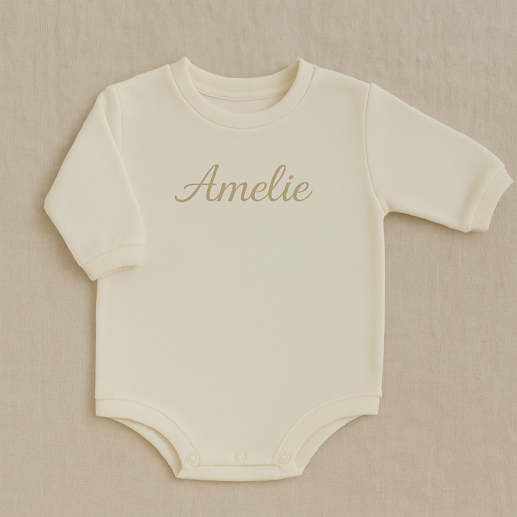 Deze zachte romper is handgemaakt in België, gepersonaliseerd met borduurwerk, duurzaam afgewerkt, perfect voor geboortelijsten, uniek als kraamcadeau, comfy voor baby’s, stijlvol in sweaterstof, oversized van pasvorm, mama-gekeurd, OEKO-TEX®-gecertificeerd, geschikt voor herfst en winter, makkelijk aan te trekken, verkrijgbaar in neutrale tinten, ideaal voor onderweg, met liefde gemaakt, origineel geschenk, praktisch én mooi, modern design, handwerk van Caro B Handmade, favoriet onder jonge ouders.