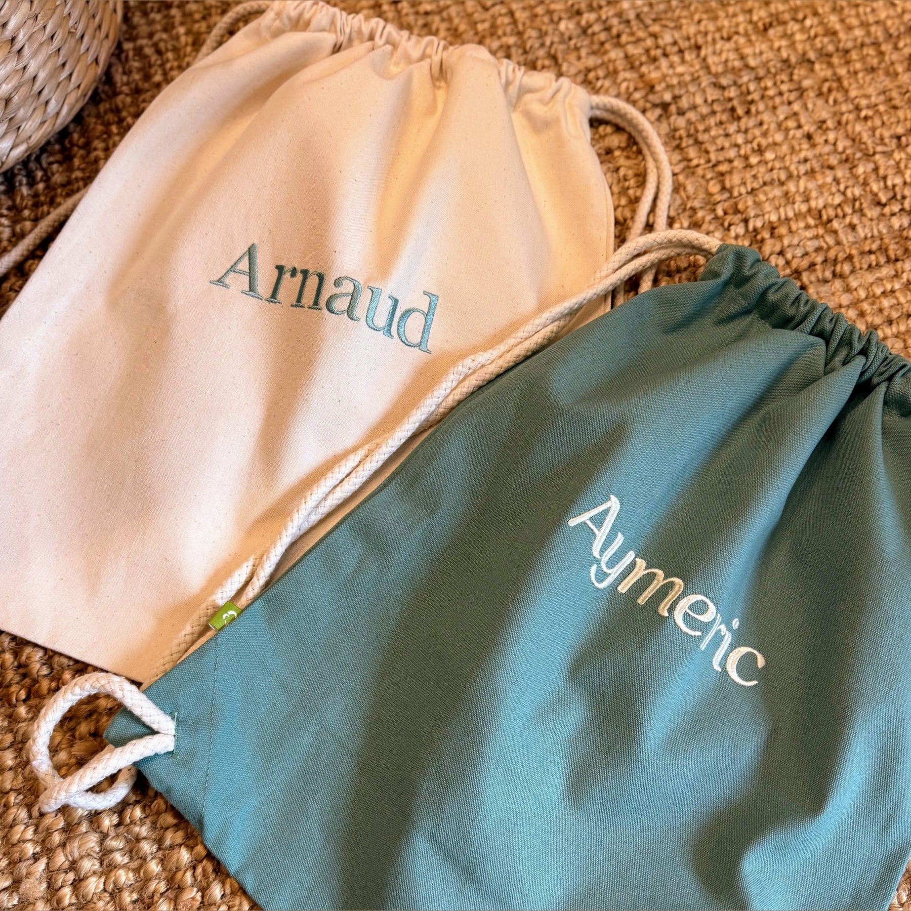 Sac de sport personnalisé 100% écologique avec nom, cadeau idéal. Cadeau de naissance équitable.