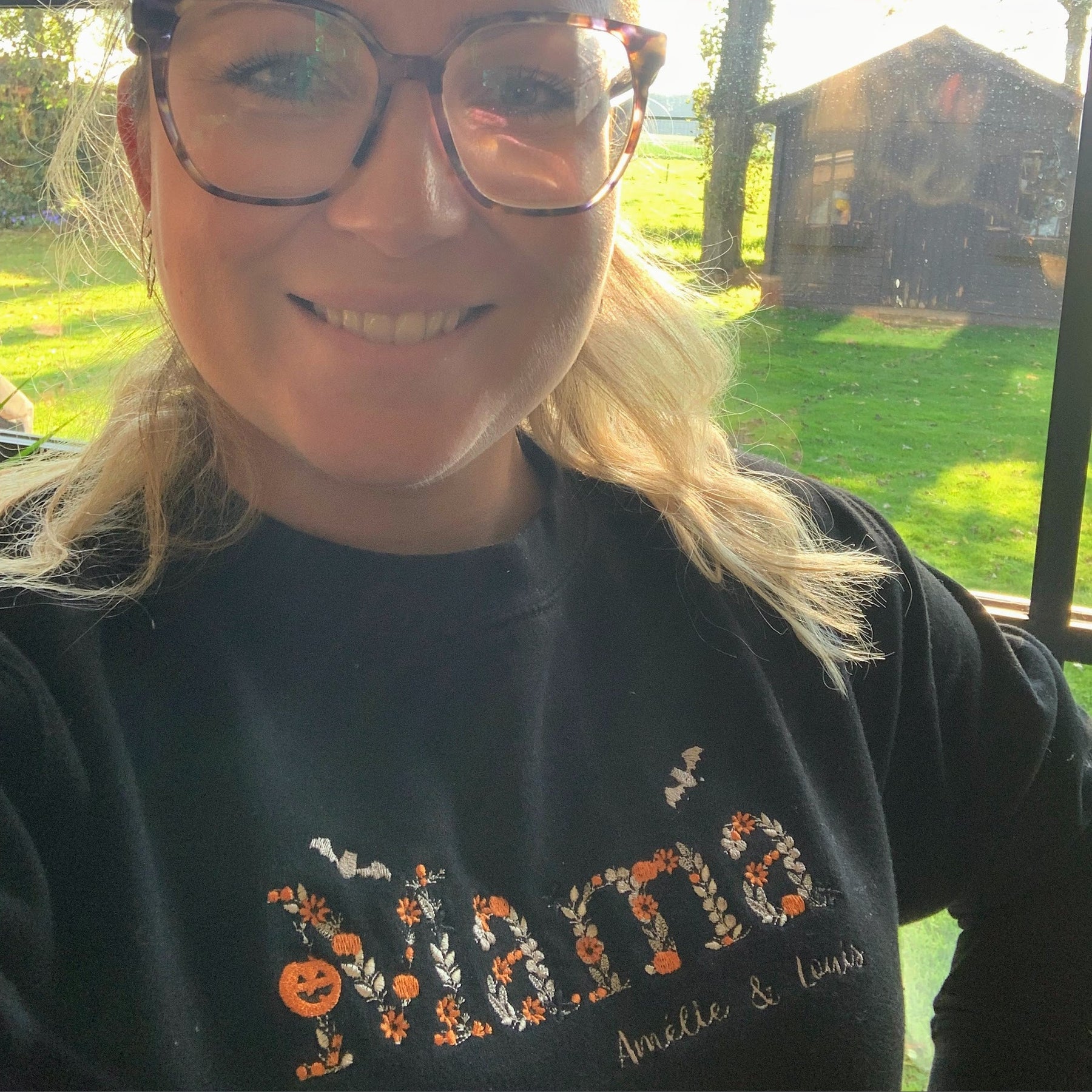 Halloween Mama Sweater - Met Pompoenen, Spinnen & Namen van je Kindjes - Caro B Handmade
