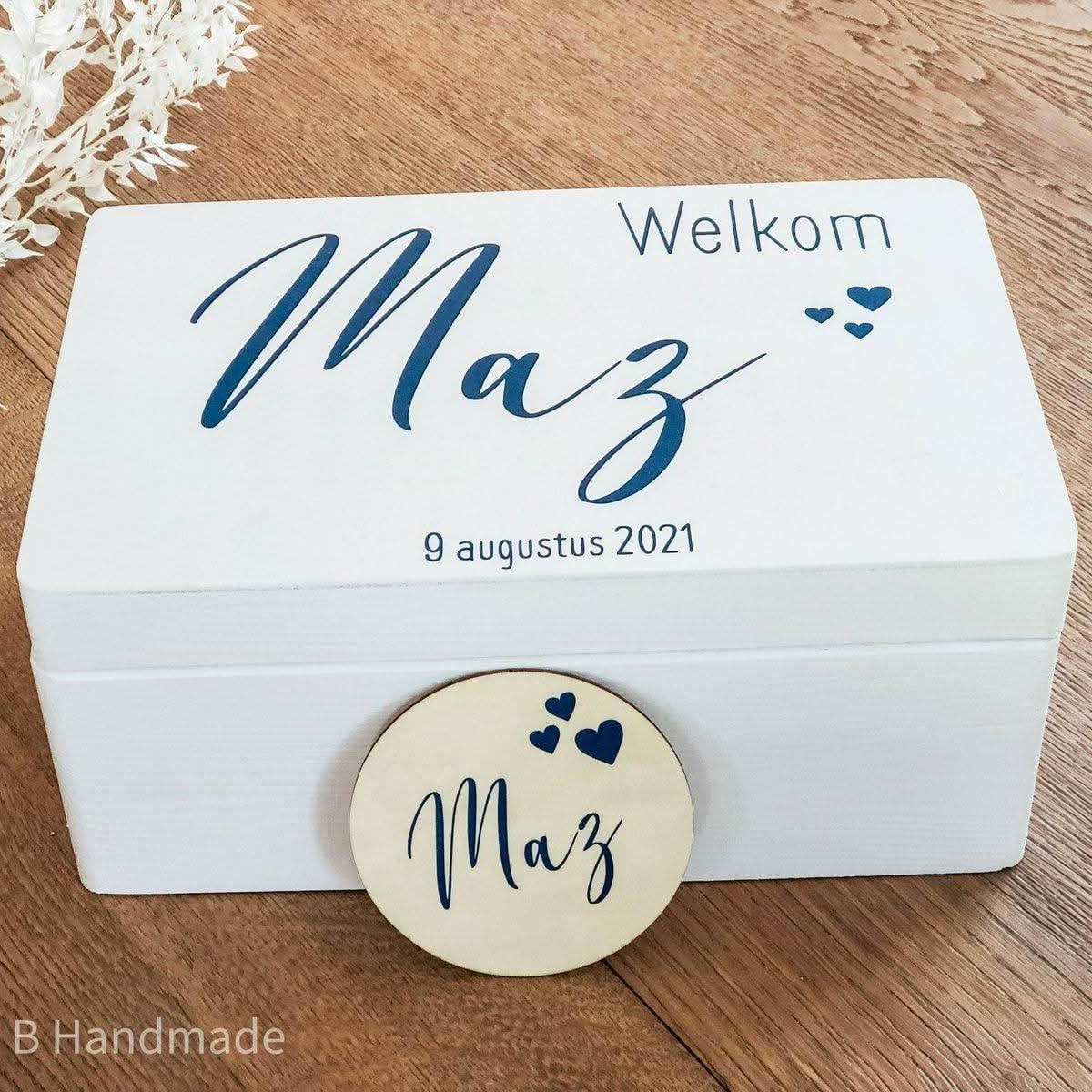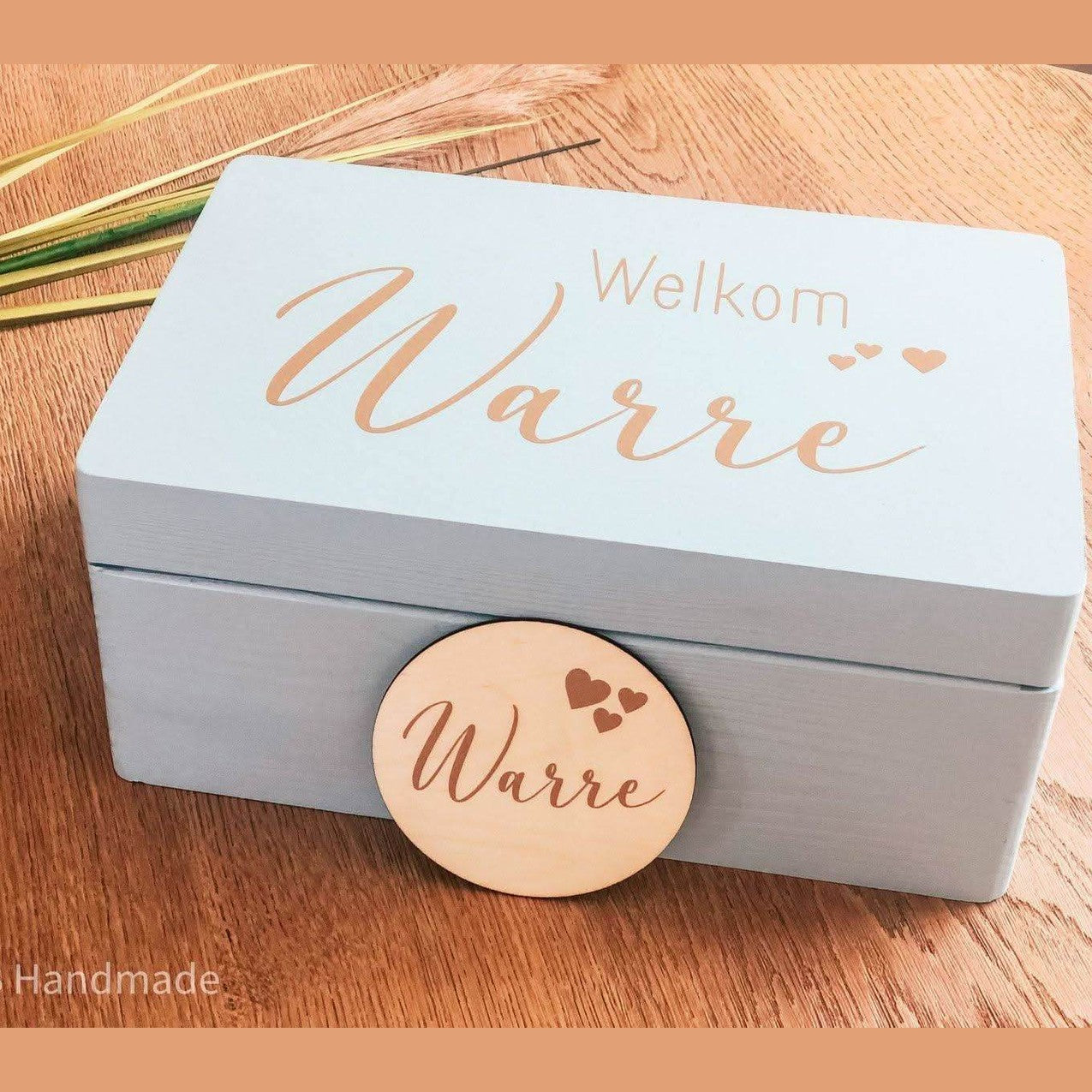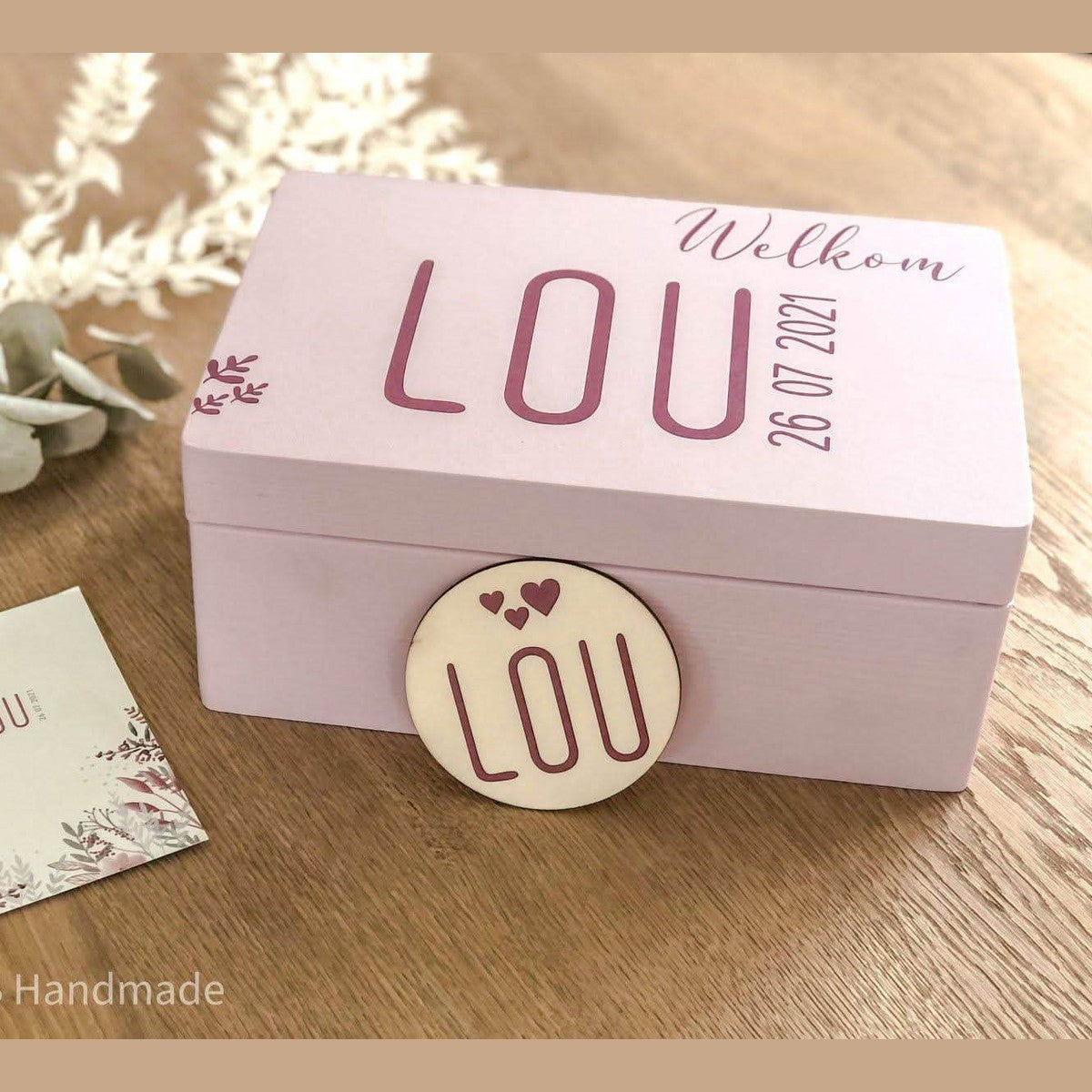 Vous personnalisez cette boîte de naissance avec l'impression de votre choix (comme le nom et la date de naissance) sur le couvercle de la boîte. Ce coffret convient également comme cadeau pour vous-même ou comme cadeau unique pour la naissance d'une fille ou d'un fils. Vous pouvez également y ranger de jolies choses ou utiliser la boîte comme accessoire dans la chambre d'un enfant plus âgé.