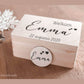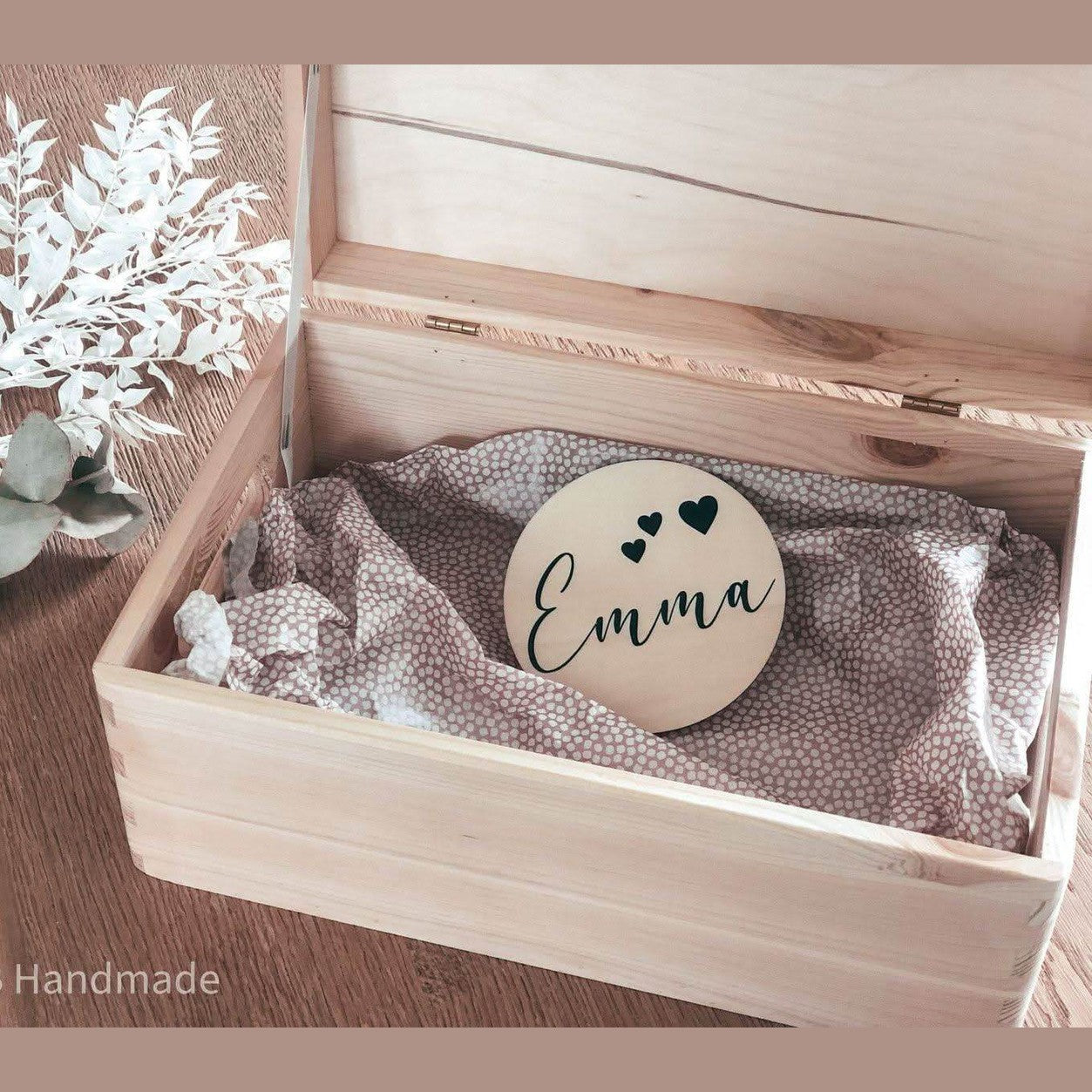 Cette magnifique boîte à souvenirs en bois massif est dotée d'un couvercle à rabat et de beaux coins arrondis. La boîte est livrée avec une carte nominative ronde en bois avec nom imprimé que vous pouvez utiliser lorsque vous prenez des photos de votre bébé.