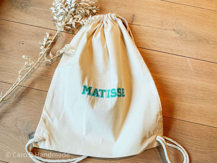 Sac de sport personnalisé 100% écologique avec nom, cadeau idéal. Cadeau de naissance équitable.