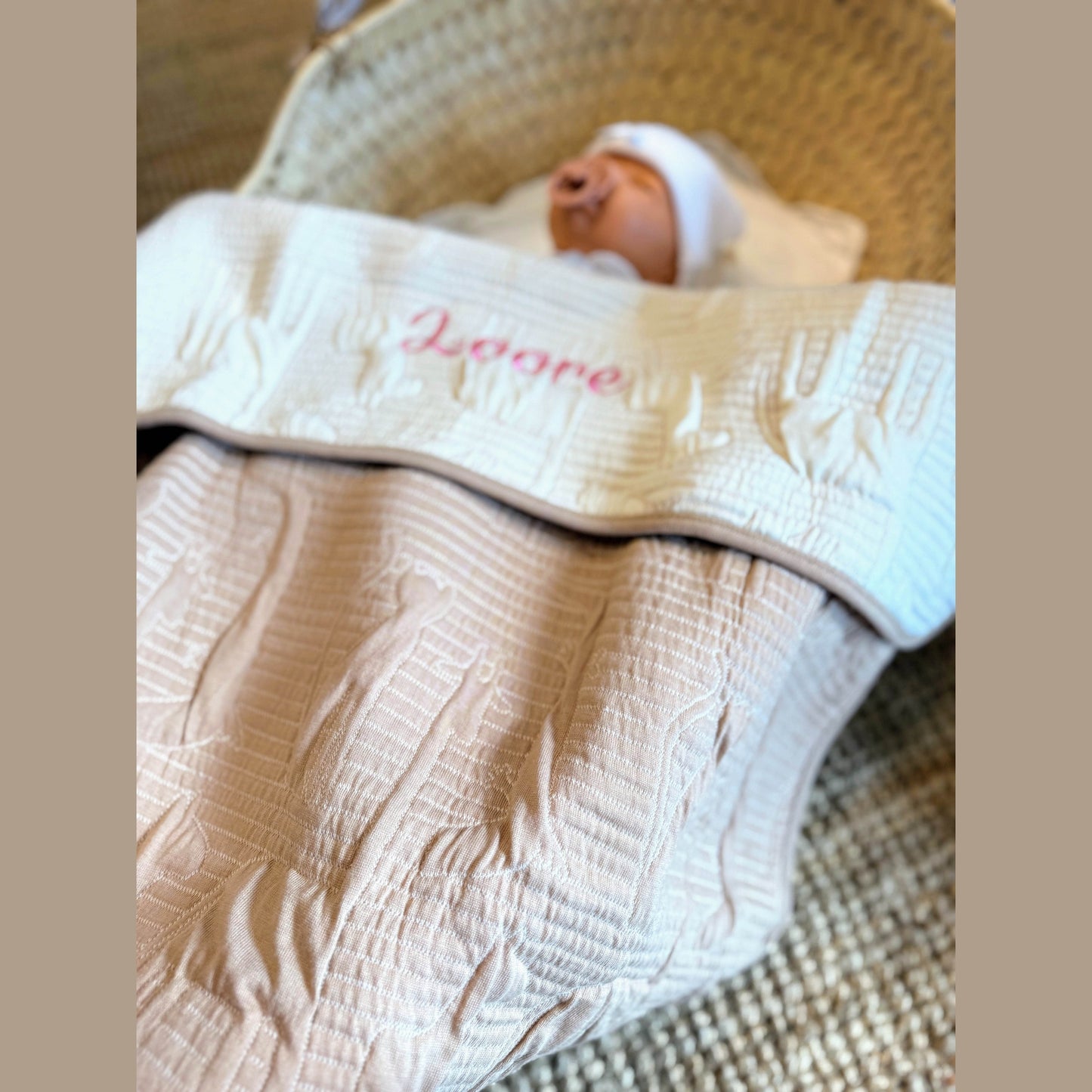 Rendez votre couverture bébé complètement unique en brodant le prénom de votre bébé. Vous pouvez choisir entre une broderie sur la couverture pour bébé faite à la main dans la couleur et la police de votre choix. Le prénom brodé aura une taille d'environ 15 cm à 23 cm. Selon la taille du nom. Cela vous donne une couverture pour bébé UNIQUE.