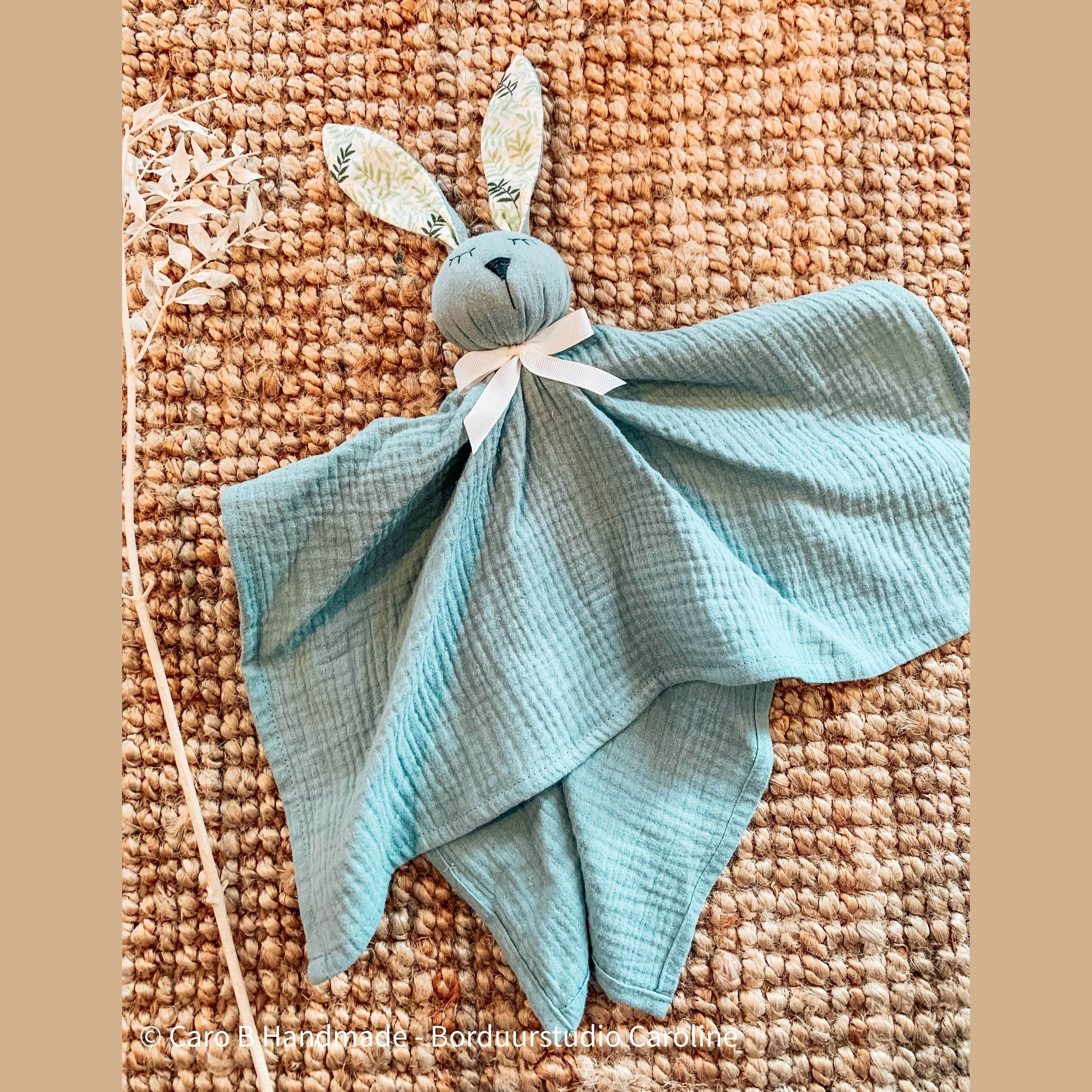 Knuffelpopje & Knuffeldoek konijn met oortjes Geborduurd met naam - Hydrofiel - Mint - Caro B Handmade