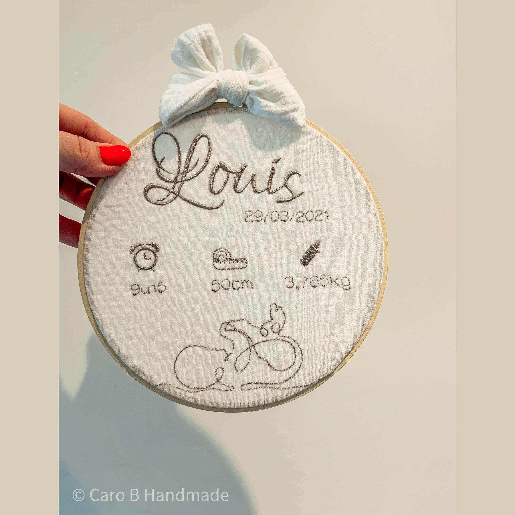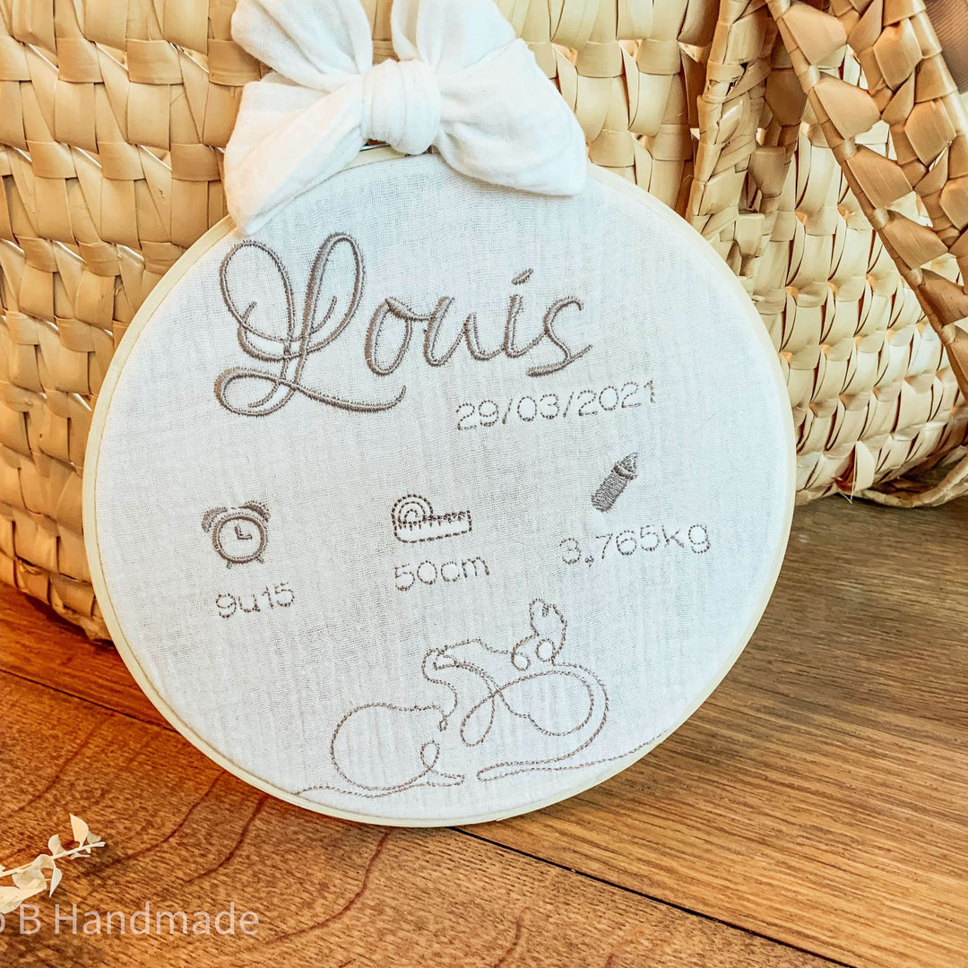Laat alle geboortegegevens van je baby borduren op de tamboerijn.