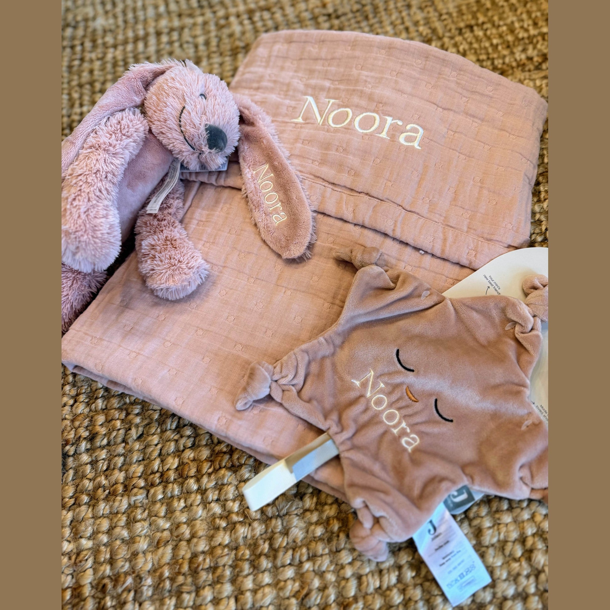 Maak jouw hydrofieldoek volledig uniek door de naam van je baby op te borduren. Je kan kiezen tussen borduur op het hydrofieldoek in de kleur en lettertype naar keuze. De borduur wordt geborduurd bovenaan in het midden. Wens je een andere plaats, dan kan je dit aanduiden bij "Extra Informatie".