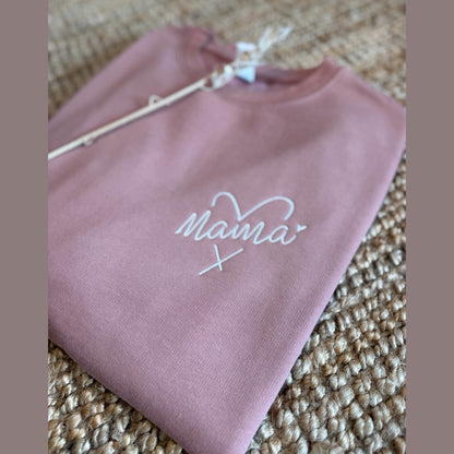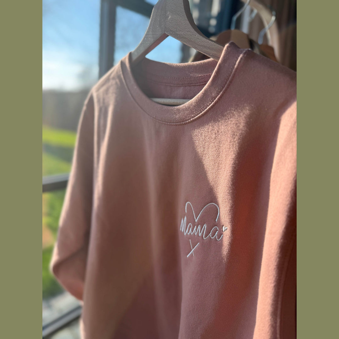 Deze zoet geborduurde trui is voorzien van een mama-tekst met een hart. Kiest voor de kindjes hun namen te borduren op de mouw. Dit kan je bij de opties selecteren. Opgelet: max 3 namen/mouw. Een heerlijk persoonlijk kledingstuk om trots te dragen, met een comfortabele unisex pasvorm.