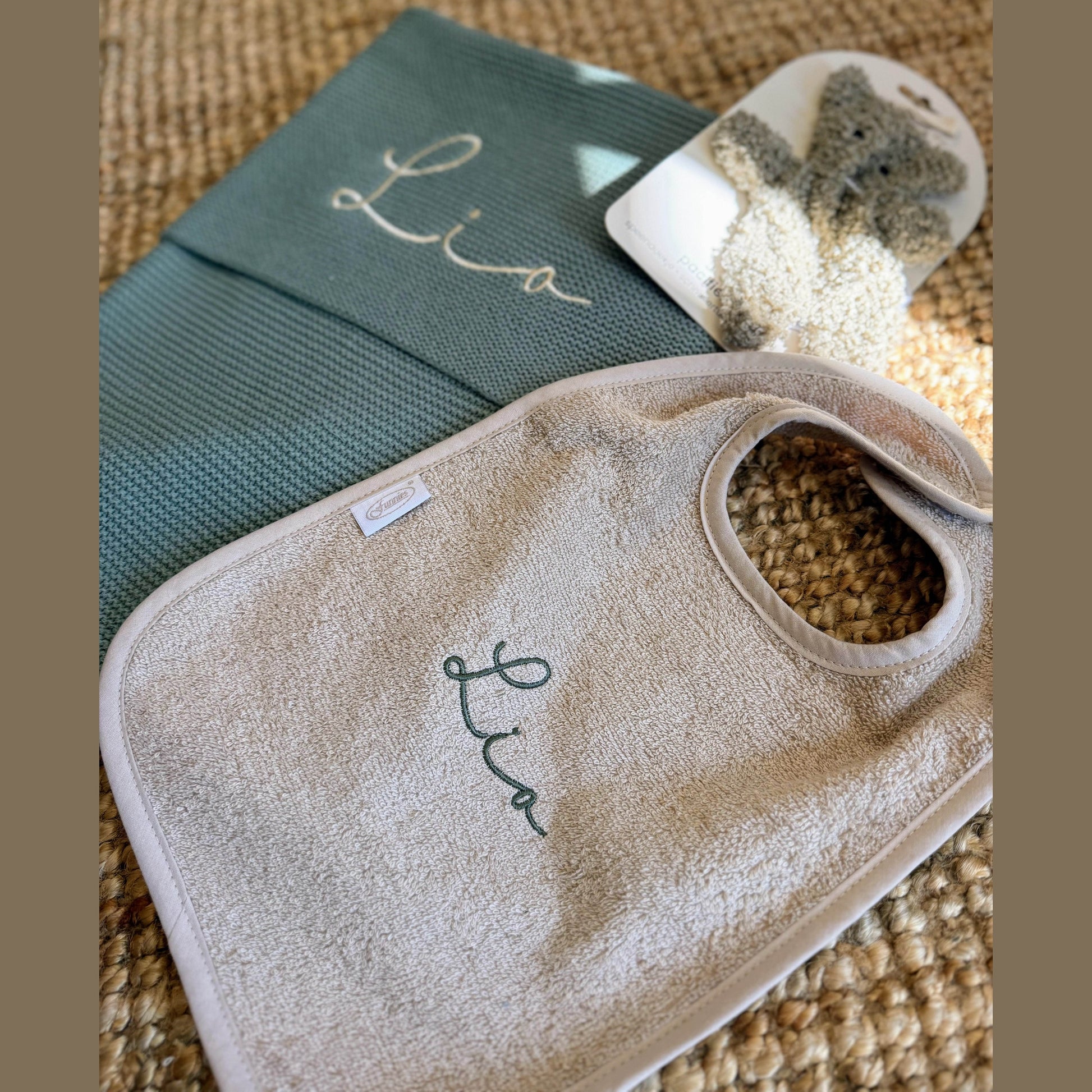Maak het dekentje écht uniek met een persoonlijke borduring. In onze winkel in Merchtem kan je zelf de naam, geboortedatum of zelfs een kleine tekening laten borduren op het dekentje. Je kiest volledig zelf: